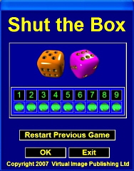 Summary of the Rules The playing board consists of the numbers 1 to 9. To ‘Shut the Box’ a player must place a counter on all nine numbers. Players take turns to throw two dice. The player can then either take the scores on each die separately or take the sum of the two scores. For instance, if the dice show a 3 and a 4, the player can put a counter on the number 3 and a counter on the number 4, alternatively, the player can place a counter on the number 7. The player continues to throw the dice until no valid move is possible. The dice then pass to the next player. The players score points equal to each number that they cover. After five rounds the player with the highest score wins. The game is designed for 2 - 4 players or one player against the computer.